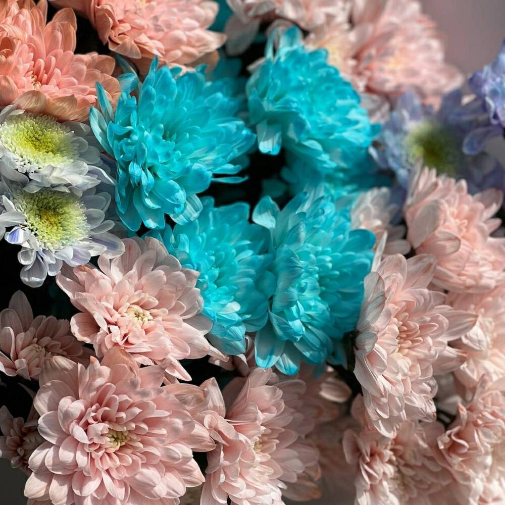 Шикарный яркий букет из радужной хризантемы станет отличным подарком для ваших родных и близких и долго будет радовать своими красками