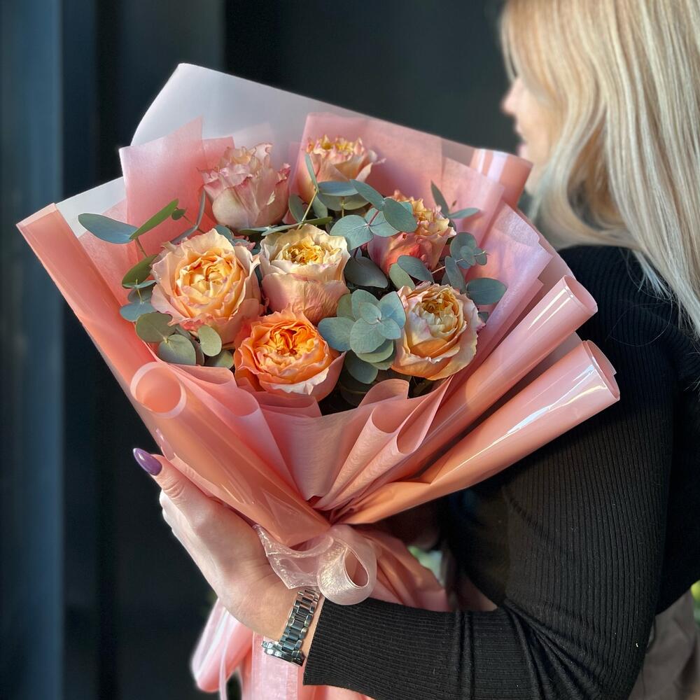 Роза садовая – 7 шт.Эвкалипт – 3 шт.Упаковка дизайнерская – 2 шт.Лента атласная – 1 шт.
