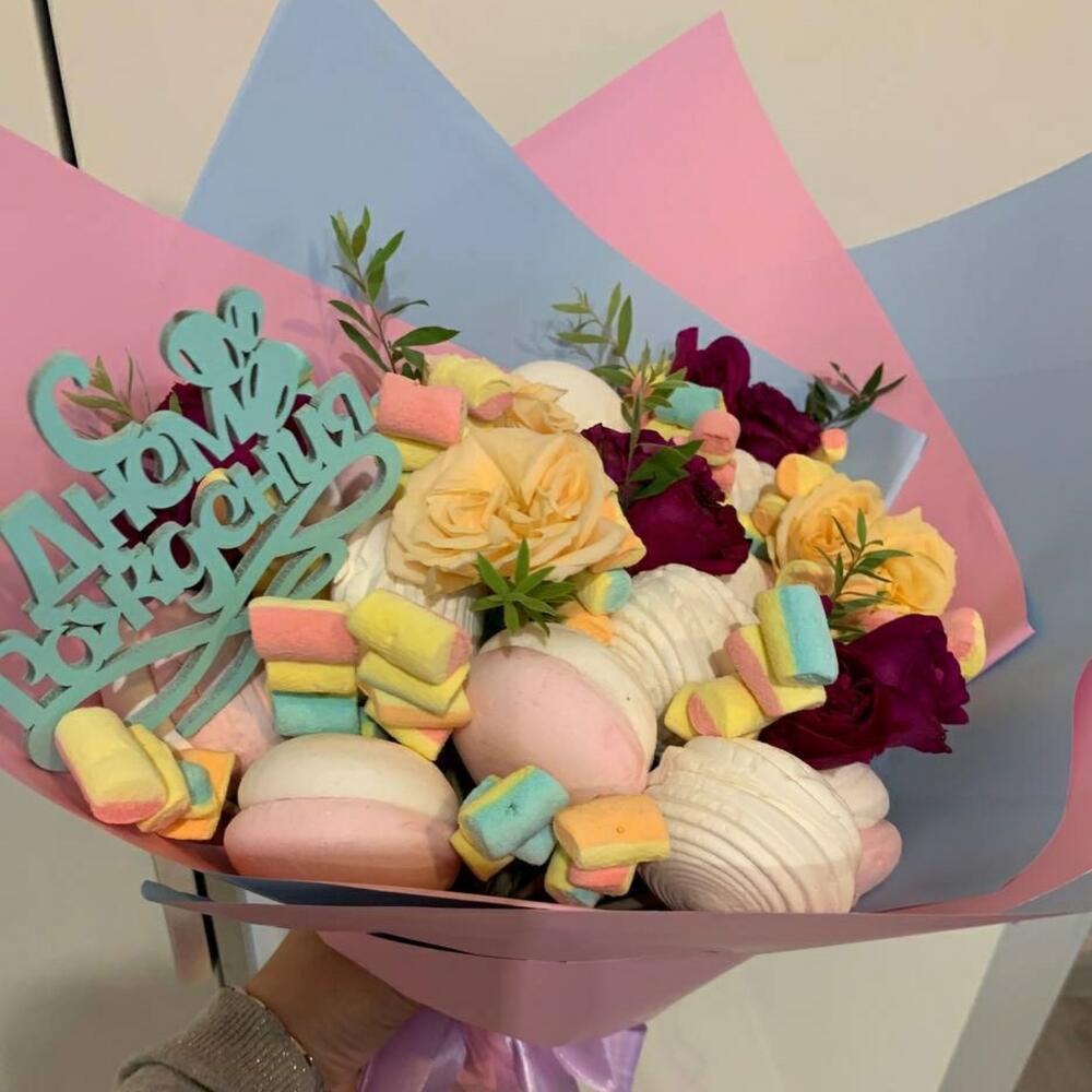 Упаковка дизайнерская – 1 шт.Зефир ванильный – 6 шт.розы кустовые – 11 шт.зефир бело розовый – 12 шт.мешмеллоу – 40 шт.