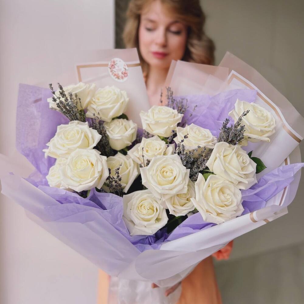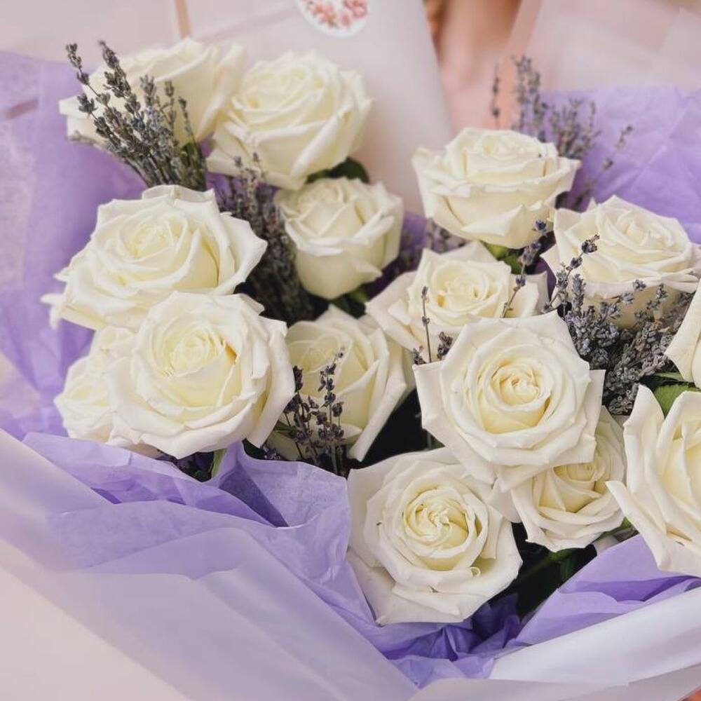 белые розы – 15 шт.Лаванда пучок – 1 шт.Упаковка дизайнерская – 1 шт.