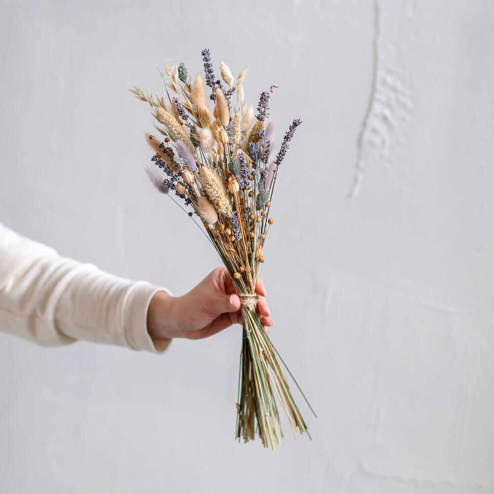 Лаванда – 3 шт.Цинерария – 1 шт.Лен – 1 шт.Лагурус – 2 шт.Сетария – 1 шт.Фаларис – 2 шт.Дизайнерская упаковка – 1 шт.дикий овес – 1 шт.
